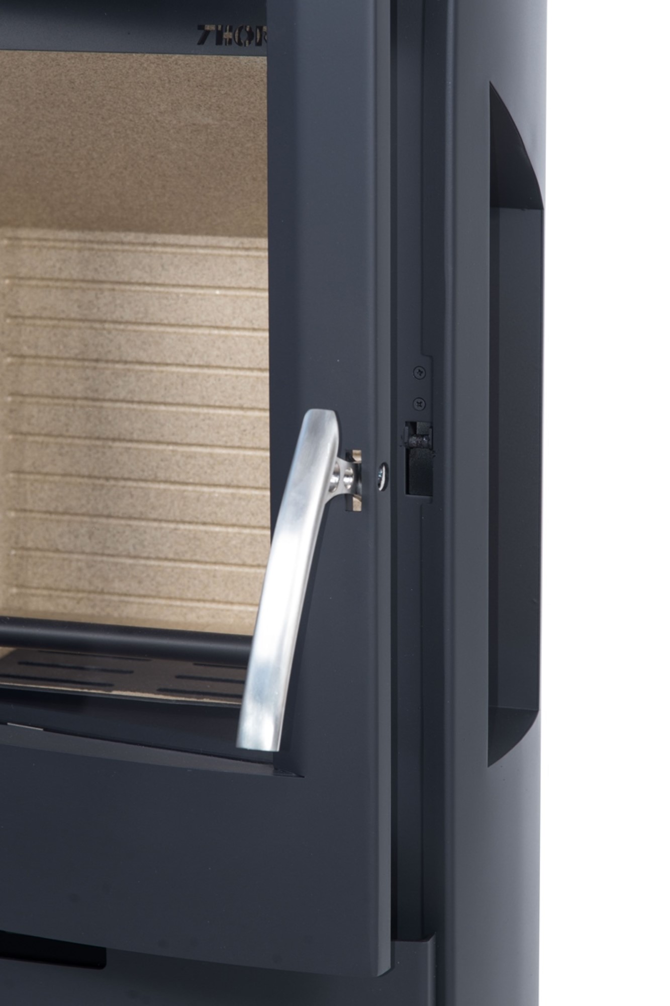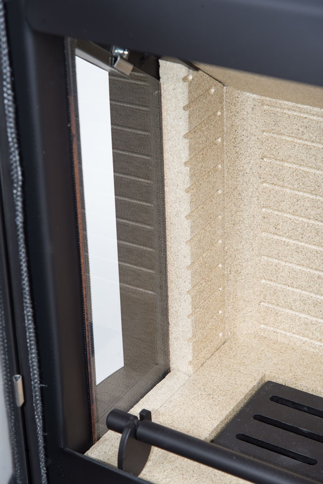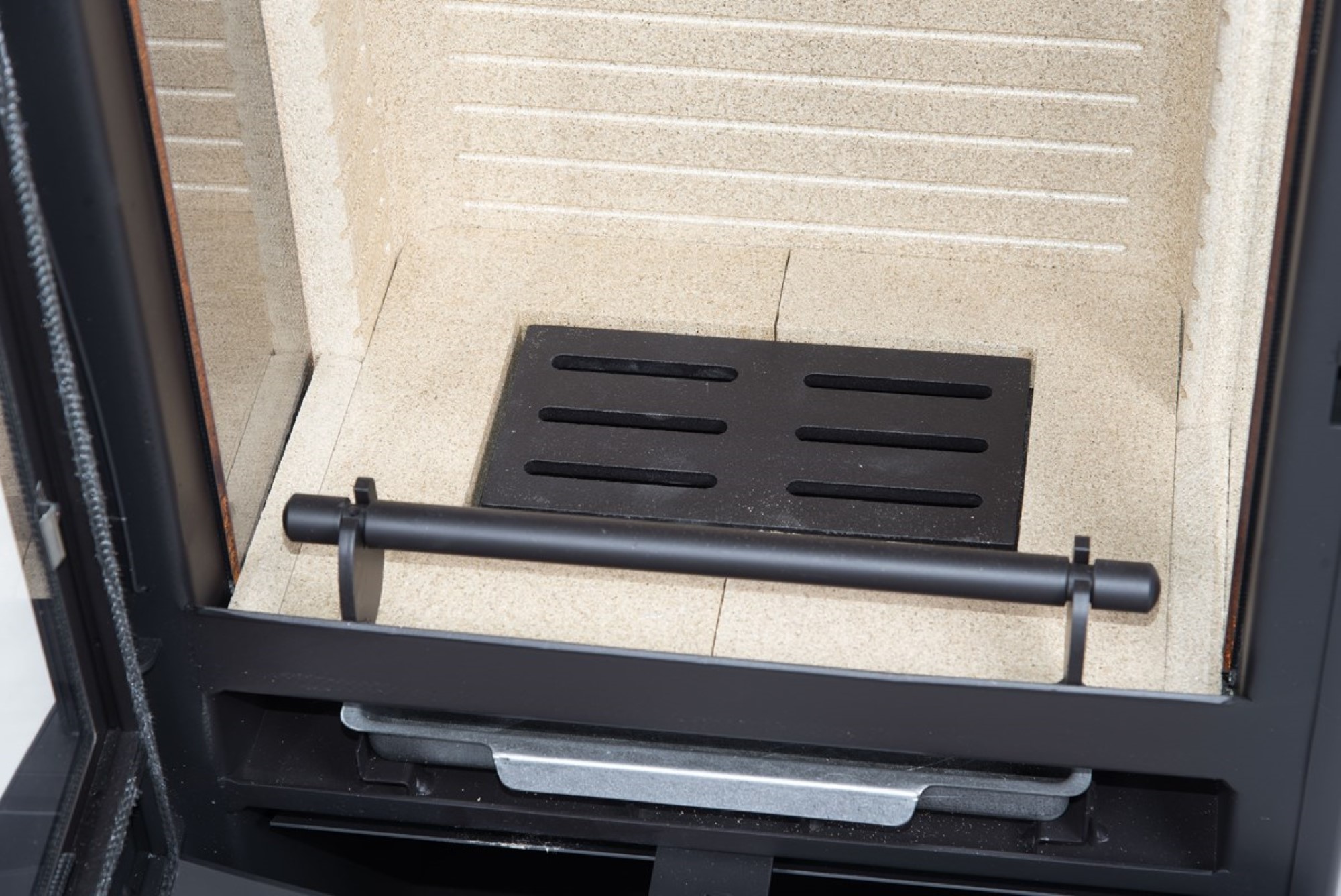 Belsejében strapabíró vermikulit bélés található, amelyet öntöttvas rostély egészít ki, biztosítva kiváló égéshatékonyságot és optimális hőhasznosítást. A nikkelezett fogantyú stílusos megjelenést és kényelmes használatot garantál.